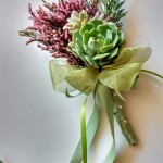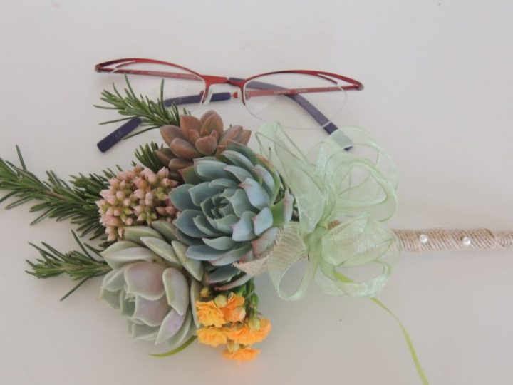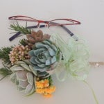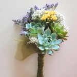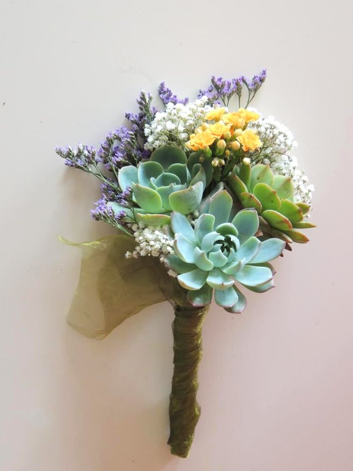 - Three (2.3-3 inch) Echeveria succulents with filler flowers and foliage. Bouquet measures approximately 7 inches across.