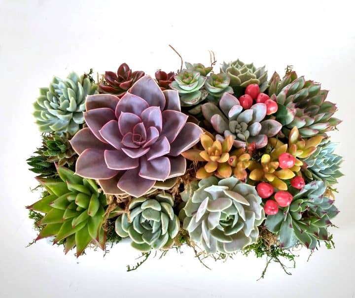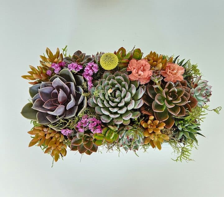Created in a wooden box this succulent and cactus centerpiece has a variety of succulent rosettes with cactus and is accented with flowers and colorful moss. This arrangement can be displayed indoors or outside. This is a great way to say "thinking of you" or "thank you"! Box measures 7.5 x 7.5 x 4