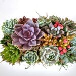 The container measures about 17 inches long for the boat shape or 14 inches in diameter for the round gray vessel. The theme can either be a desert with cacti and aloes or succulents with echeverias.