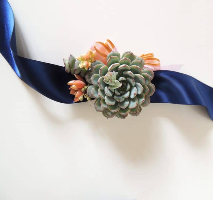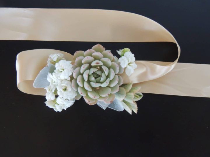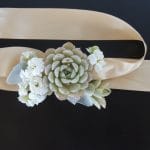 $26.00 Add to cart 100% Succulent Bouquet. Created with two dozen succulents in all different sizes and colors accentuated with kalonchoe and aeonium bloom. The stems are wrapped in natural fiber ribbon or white satin ribbon. You may choose your colors.