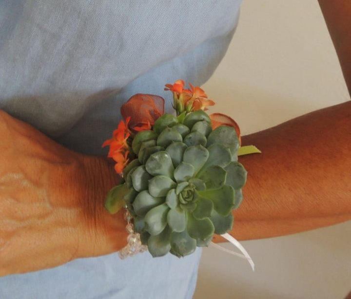 – 2 Junior Bridesmaids Bouquets – Single succulent swatted in babies breath and orange blossfeldiana
