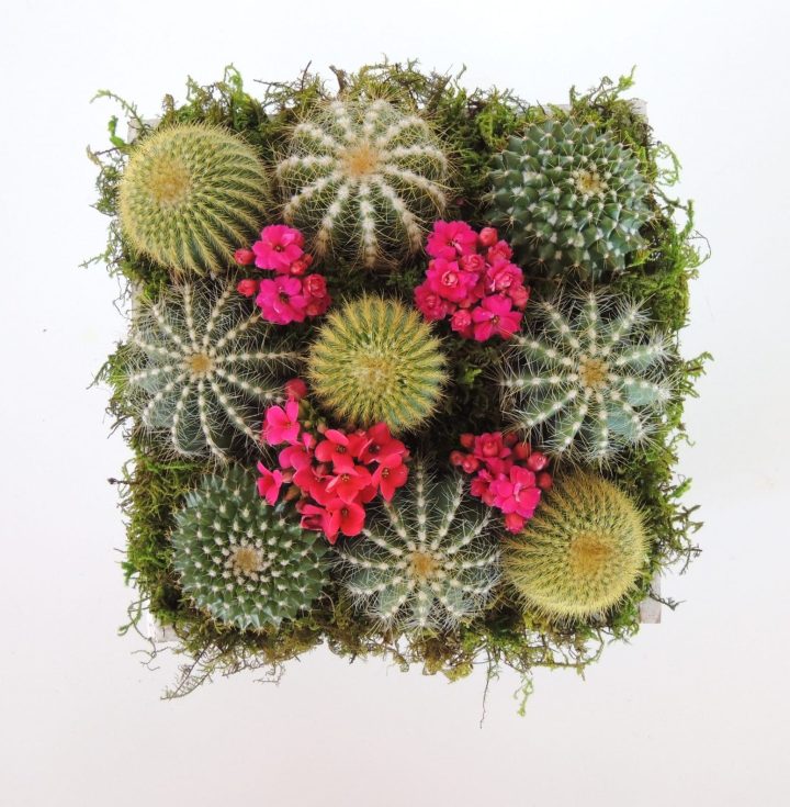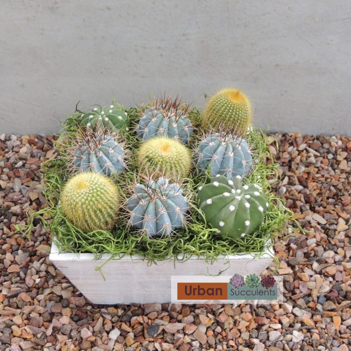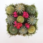 Created in a wooden box this centerpiece has a variety of cactus and is accented with colorful moss. This arrangement can be displayed indoors or outside. This is a great way to say “thinking of you” or “thank you”!