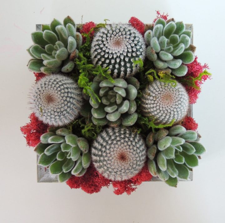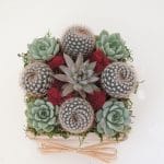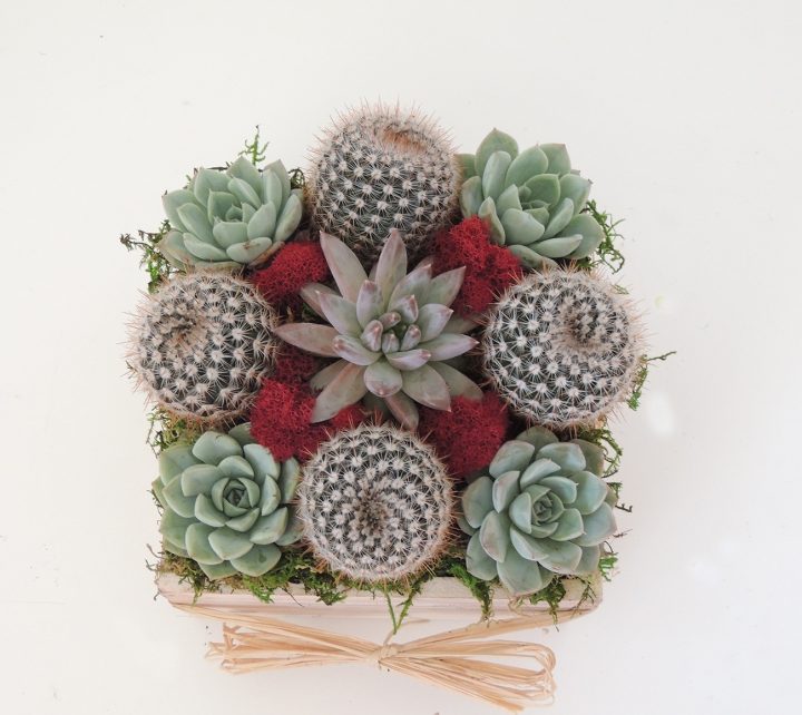 Created in a wooden box this succulent and cactus centerpiece has a variety of succulent rosettes with cactus and is accented with flowers and colorful moss. This arrangement can be displayed indoors or outside. This is a great way to say “thinking of you” or “thank you”!