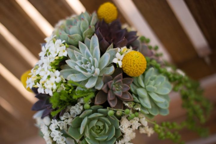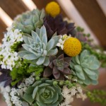 Bridal bouquet created with all the green, deep purple and bluish succulents white mums with a touch of crapedias for yellow.