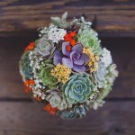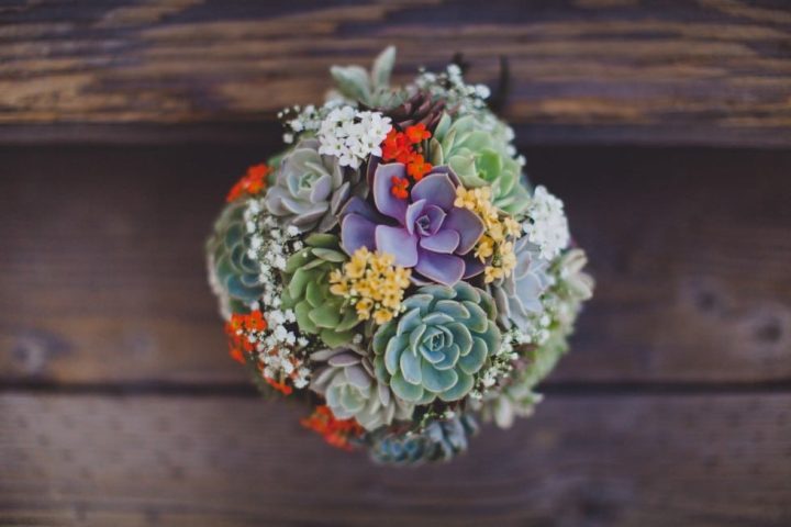 Created with two dozen succulents in all different sizes and colors. It can be accented with kalonchoe blooms that come in a wide range of colors including yellow, orange, pink and white.