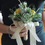 Succulent wedding bouquet created with echeveria hen and chicks.This bouquet is created with 7 2-inch succulents and a few splashes of color from statice flowers or kalonchoe blooms.