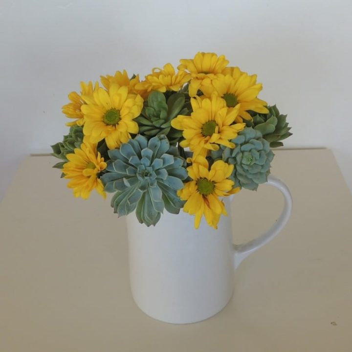 I will select a set of 6-8 succulents of various sizes plus kalonchoe bloom and any other succulent blooms available to wire, all you have to do is arrange them in your favorite vase or glass container, no water required if you don’t add fresh flowers.
