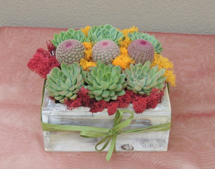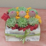 Created in a wood box this succulent centerpiece has a variety of succulent rosettes and is accented with flowers and colorful moss. This arrangement can be displayed indoors or outside. This is a great way to say “thinking of you” or “thank you”!