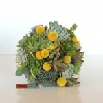 The groom/groomsmen are in dark green suits and the bridesmaids are in champagne/tan dresses. Our decoration colors are various sage-dark green and champagne -gold tones and some burlap. I like the yellow billy balls with green succulents, maybe some ivory something thrown in.