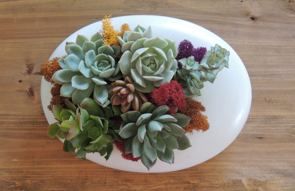 Arrangement accents to include blue thistle, purple statice complimented with green & purple reindeer moss