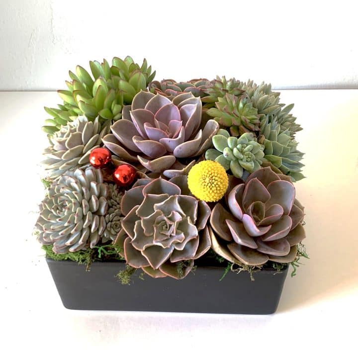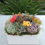 This succulent arrangement comes in sleek ceramic container and includes a variety of succulents such echeveria for color and crassula for texture.