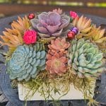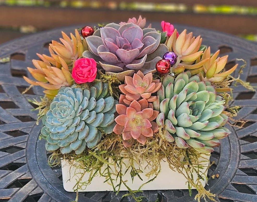 $38.00 Add to cart A festive mix of rooted seasonal succulents, including echeverias, crassulas or sempervivum make this arrangement in a 7" x 7" wood box a keeper. We accent it with colored moss and/or flowers.