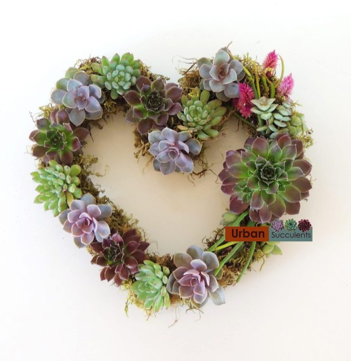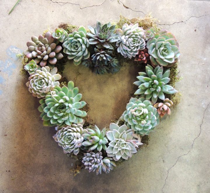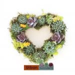 This heart wreath is made with a wire form covered with moss and decorated with succulents, it measures 10 – 12 inches across.