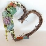 Grape vine heart wreath is made with moss and decorated with succulents, it measures 10 inches across.