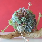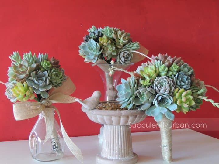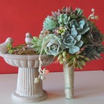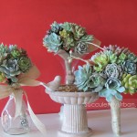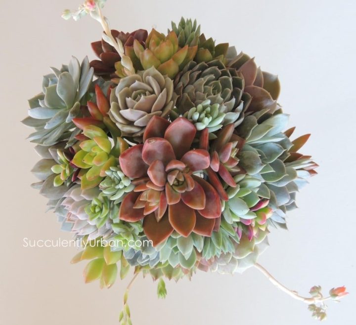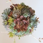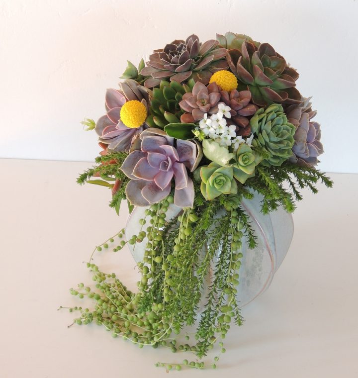 This is a stunning one-of-a-kind succulent bouquet created with with an rich assortment of succulents. It includes echeveria succulents, crassulas and sedums succulents in various shapes and sizes. We carefully select succulents that offer an array of color and to create this stunning bouquet, which is features a a cascade of senecio rowleyanus (or string of pearls).