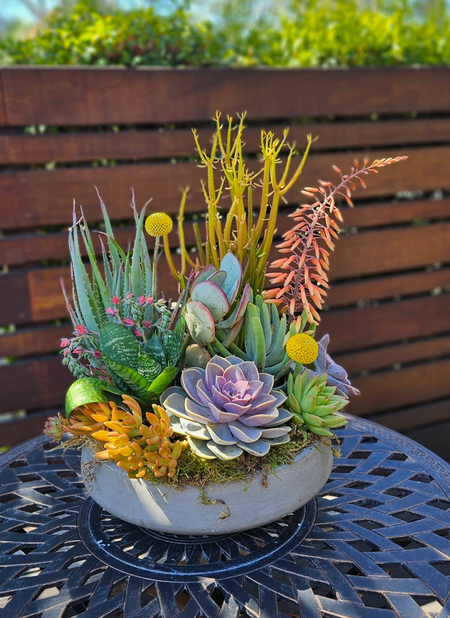 The container measures about 14 inches in diameter. It can either be a desert theme with cacti and aloes or succulent with echeverias arrangement. San Diego pick up or delivery only.