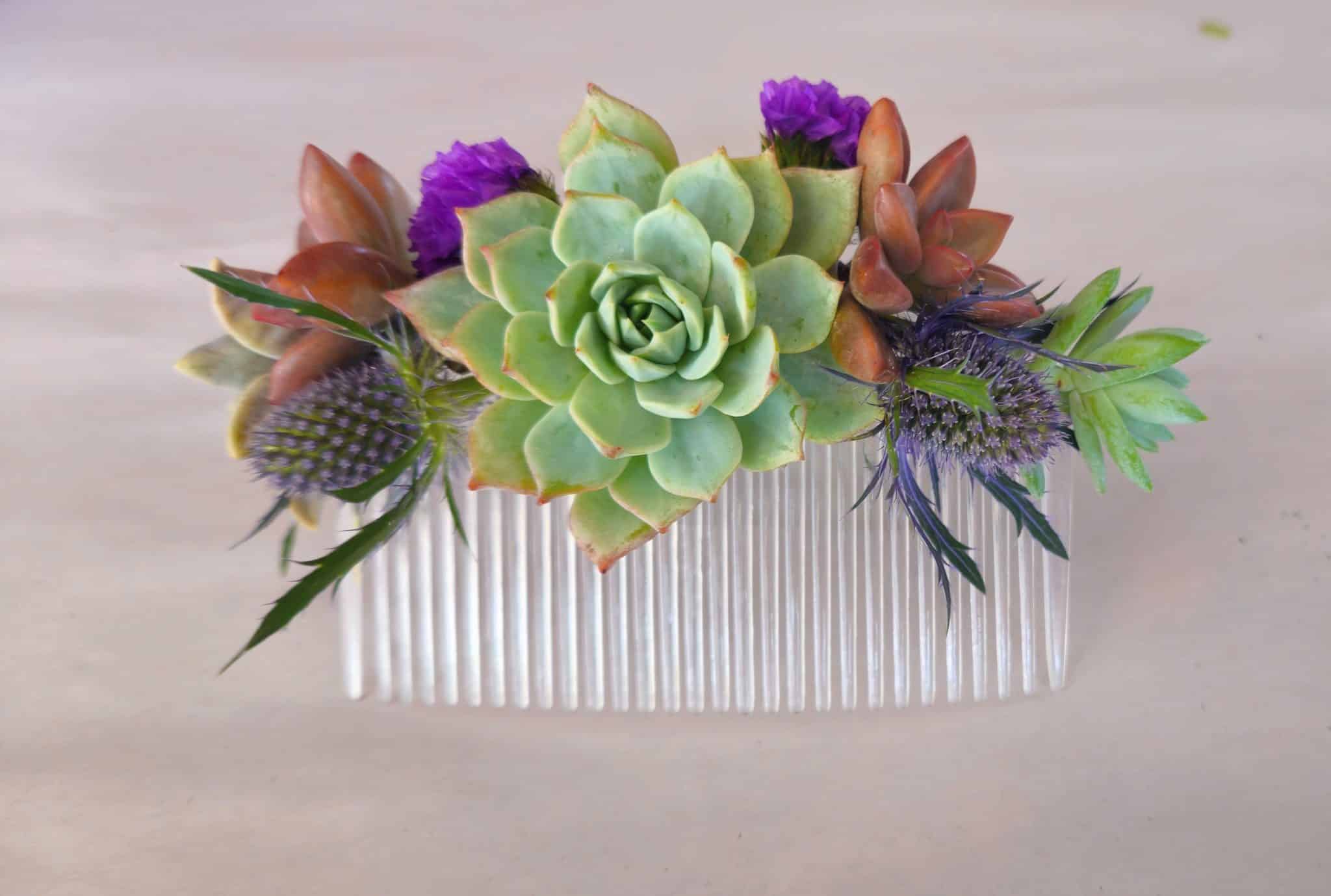 Medium size succulent comb.The comb measures 3.25″ across and the succulent is approximately 1.75″ diameter.