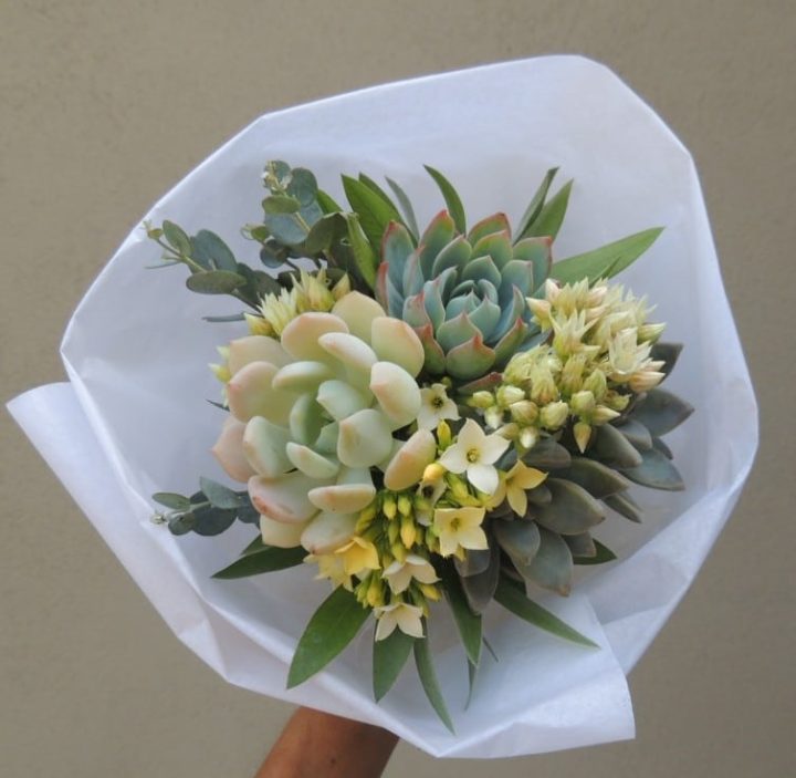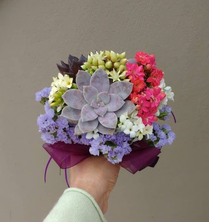Created with 4-5 two inch echeverias and filer flowers and foliage.