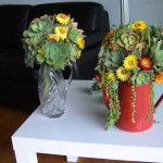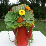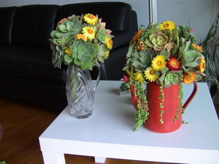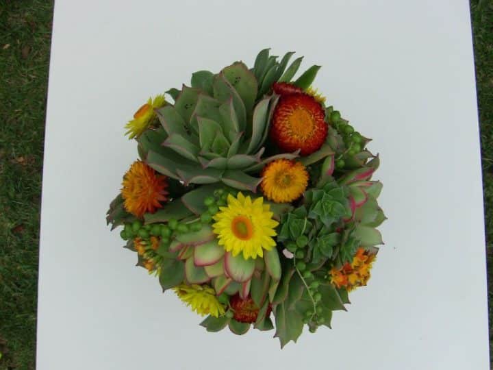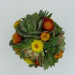 Created with succulents in all different sizes in true green tones accentuated with yellow straw flowers and orange kalonchoe.