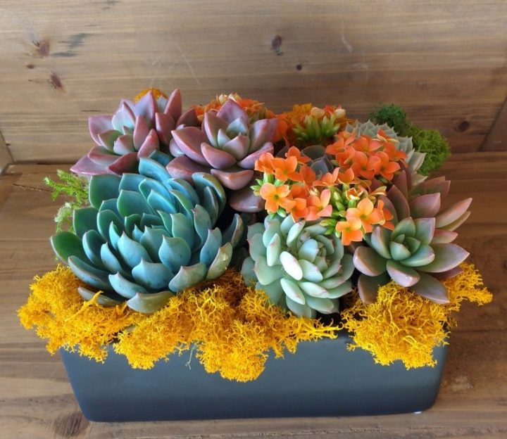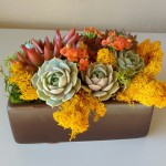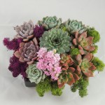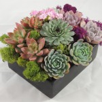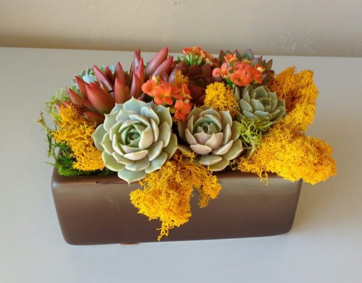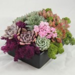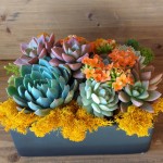 This festive living succulent arrangement is created in a 7 x 5 black, brown or white container. It comes with a colorful variety of succulents accented with green and white moss.