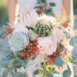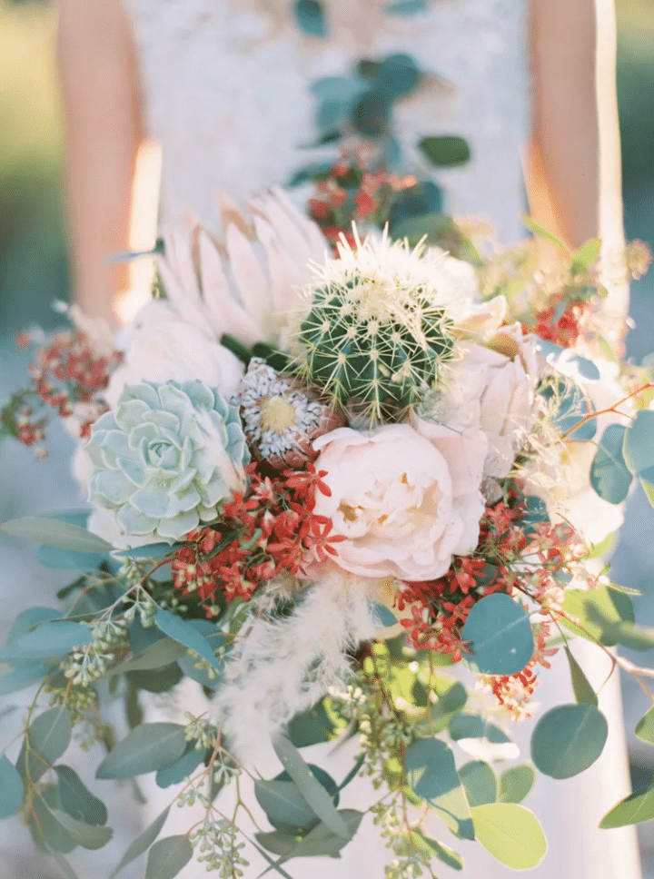 One bridal Bouquet – loose style bouquet with cacti and white berries and some orange (paprika) $185.00