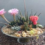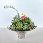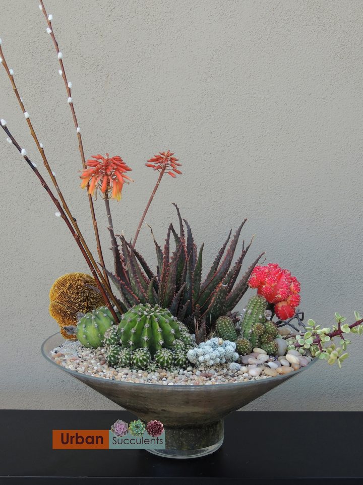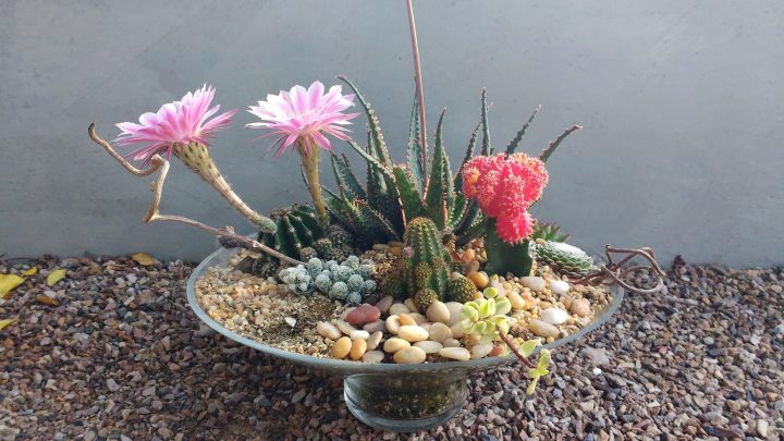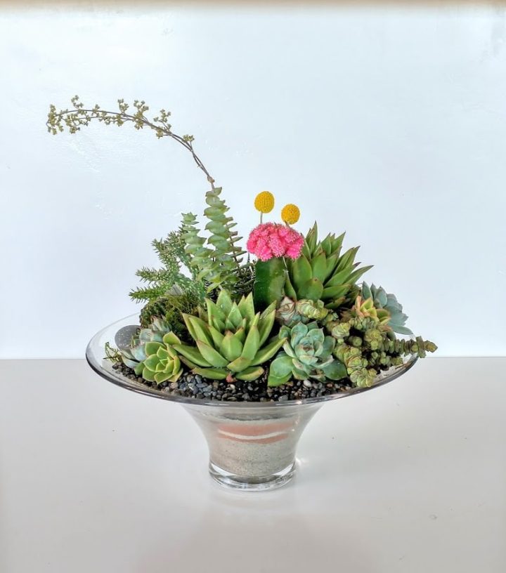 A glass vessel without drainage needs watering about every other week in summer and less in winter. Protect the composition from excessive rainfall and rotate on a regular basis to balance light exposure.