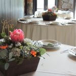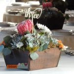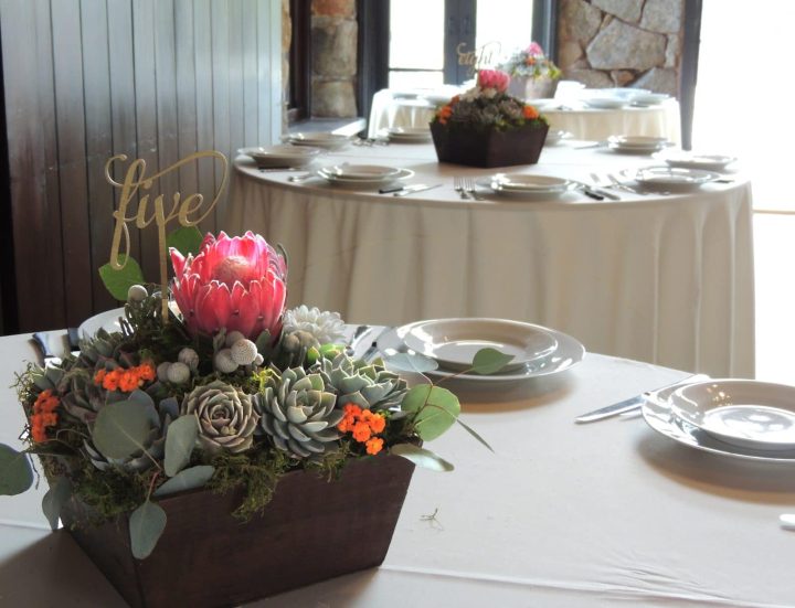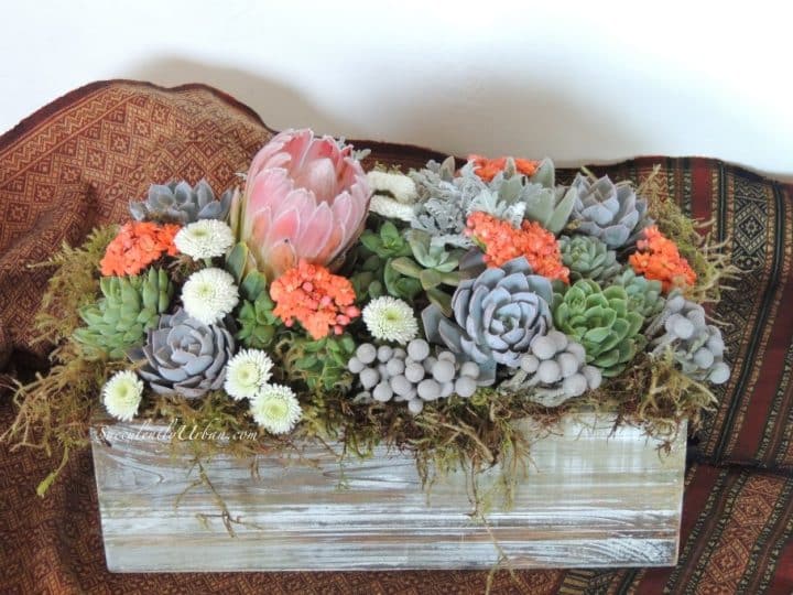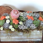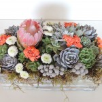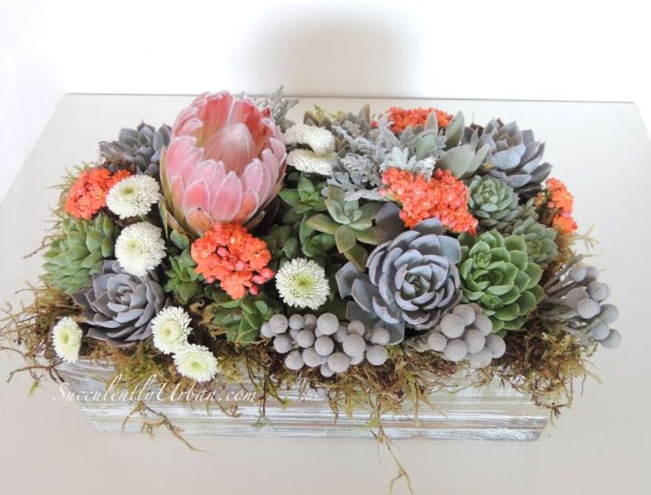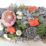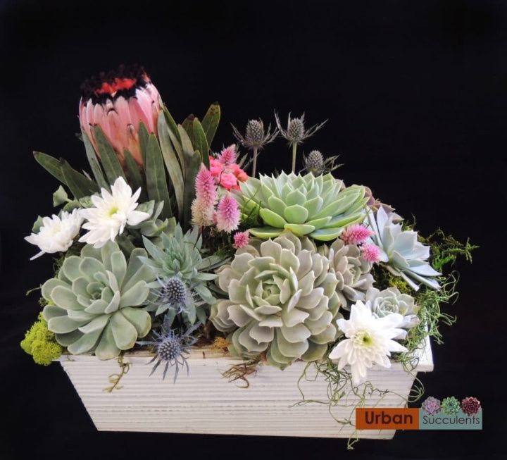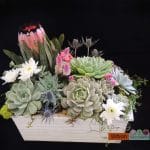 This arrangement is created with a careful selection of echeverias, proteas, blossfeldiana blooms and white mums.