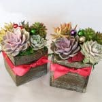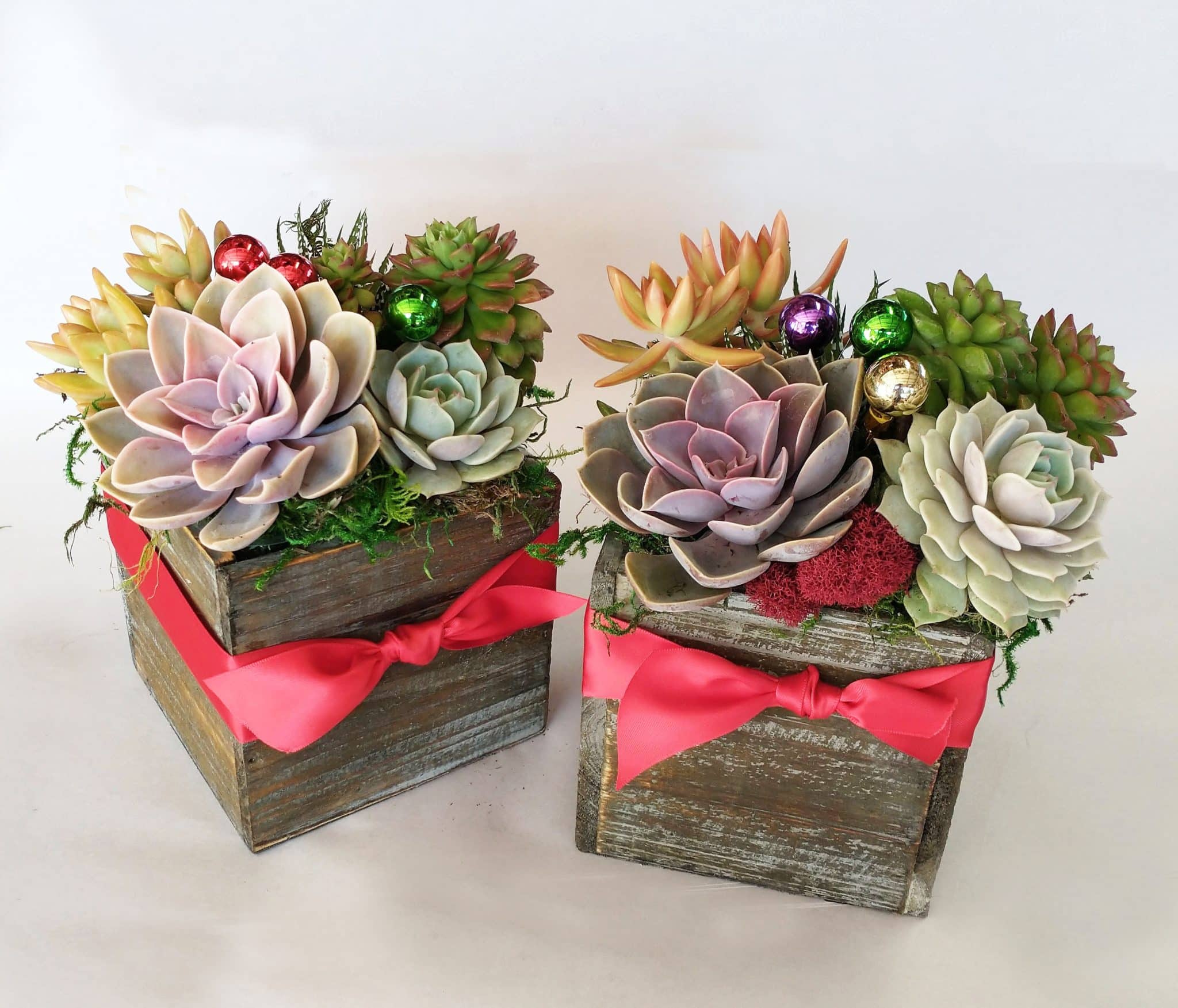 Looking for anniversary gifts? This set of two Succulent arrangements. Each arrangement comes in a 5″ x 5″ x 5″ wood box with a variety of succulent rosettes,with colorful accent moss and/or blooms. It can be kept indoors or outdoors and needs little care. Lots of natural light and occasional watering make it an ideal addition to any space.