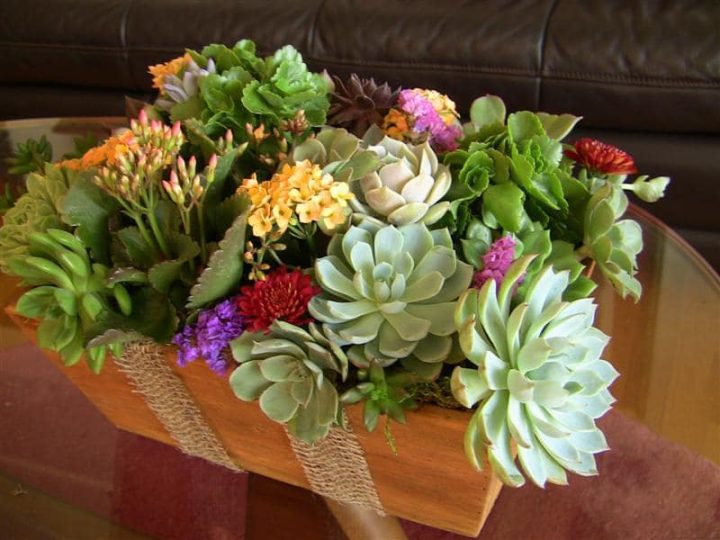 Succulent arrangement in wood trough with a variety of succulents. The wood box measures 18x6x8