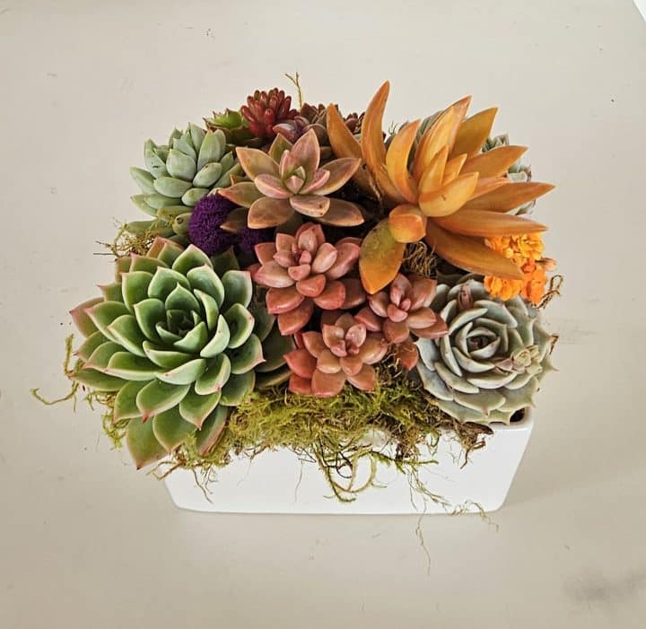 This table top succulent arrangement comes with mixture of seasonal rooted succulents in a 6” x 6”x 3” ceramic box