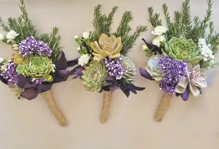 - Three (2.3-3 inch) Echeveria succulents with filler flowers and foliage. Bouquet measures approximately 7 inches across.