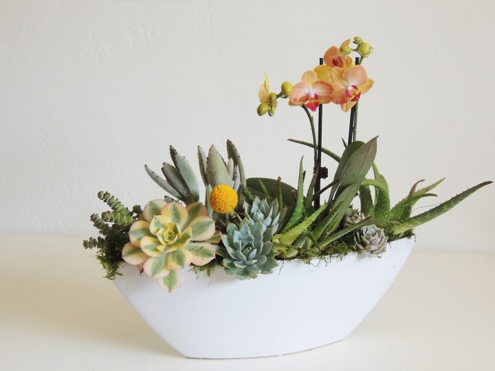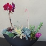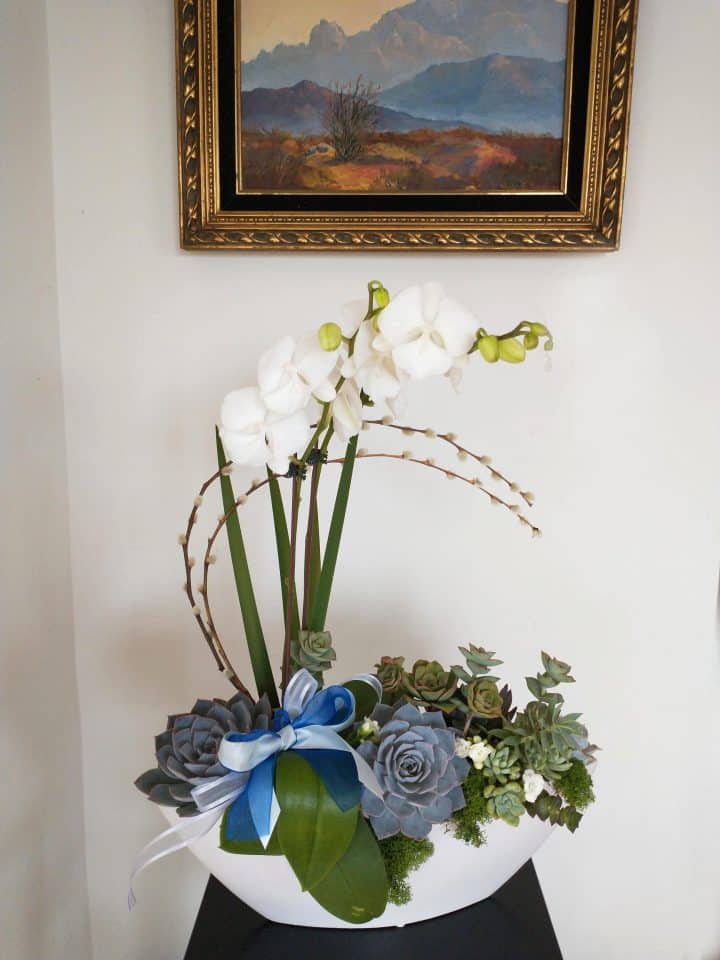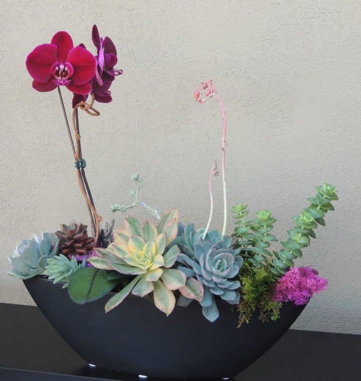 Floral arrangement with a variety of succulents an orchid and accented with colorful moss. This succulent arrangement comes in a 17″ black ceramic vessel.