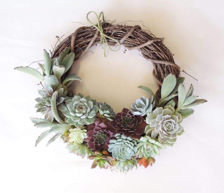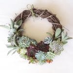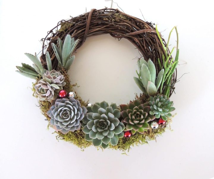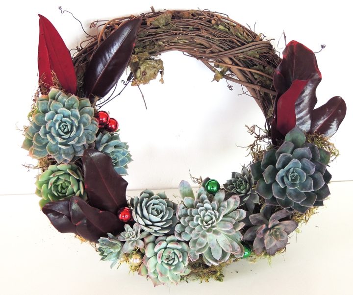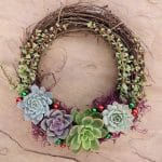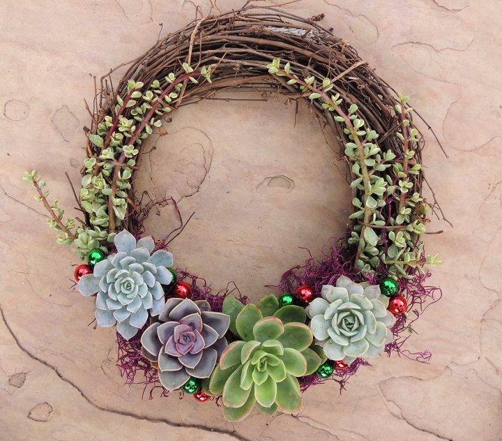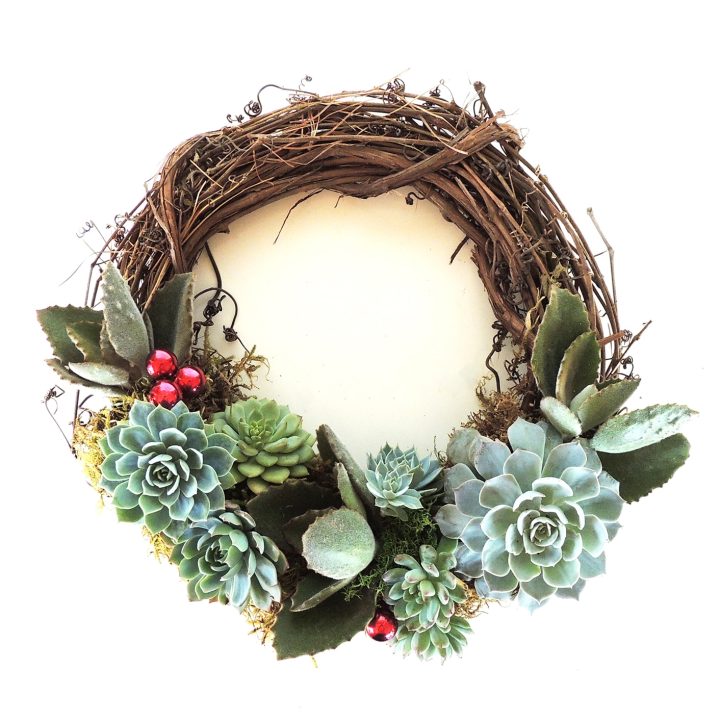 This Succulent Wreath is created using grape vine and a variety of succulents that are grown in Southern California. For the holidays we accent this wreath with Christmas balls. It measures 14″ in diameter and is approximately 4″ high.