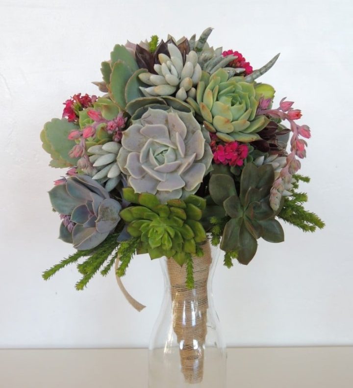 Created with 16-20 succulents in all different sizes accentuated with pink kalonchoe.