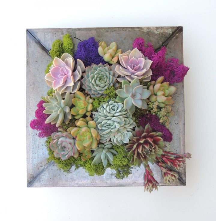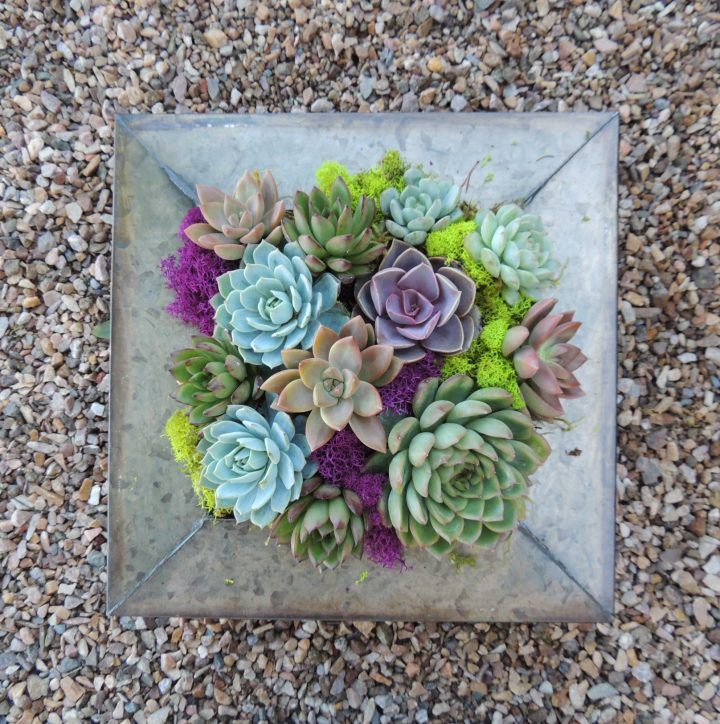 This 12″ square metal planter full of a great selection of succulents will enhance any space.