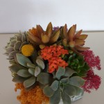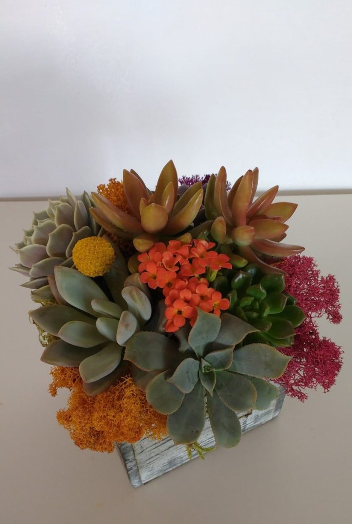 Two Succulent arrangements. Each arrangement comes in a 5″ x 5″ x 5″ wood box with a variety of succulent rosettes, Blossfeldiana blooms and colorful moss provide texture. It can be kept indoors or outdoors and needs little care. Lots of natural light and occasional watering make it an ideal addition to any space. Note: Tall version is for San Diego delivery only.